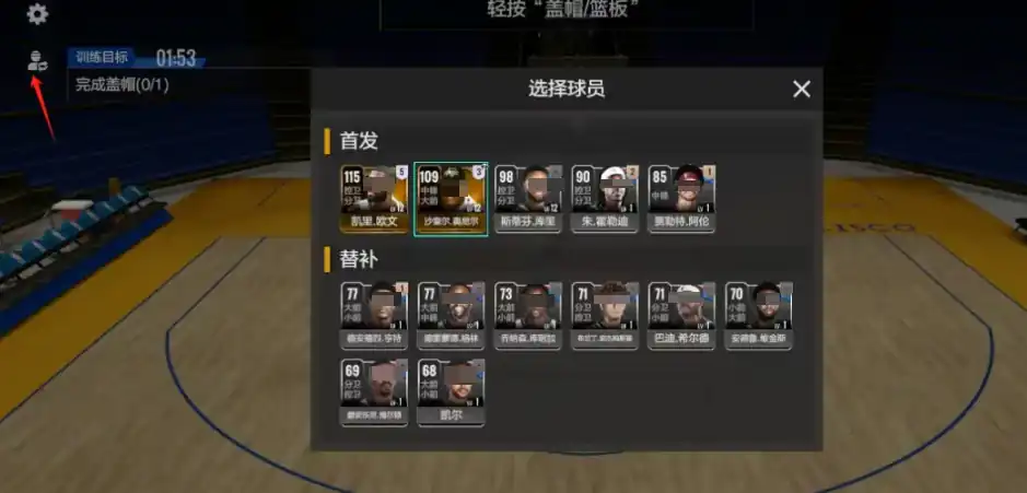 在训练营中,某些训练项目较为困难,玩家可以通过左上角的图标切换不同球员。例如,盖帽训练如果难以完成,可以换上像浓眉哥戴维斯、奥尼尔或祖巴茨等高个子球员,轻松完成任务。