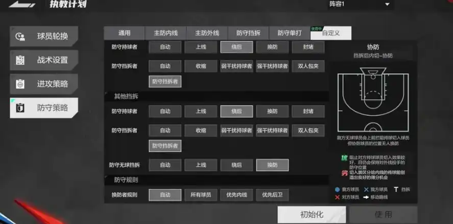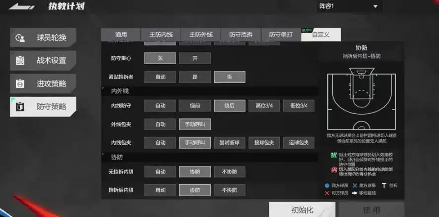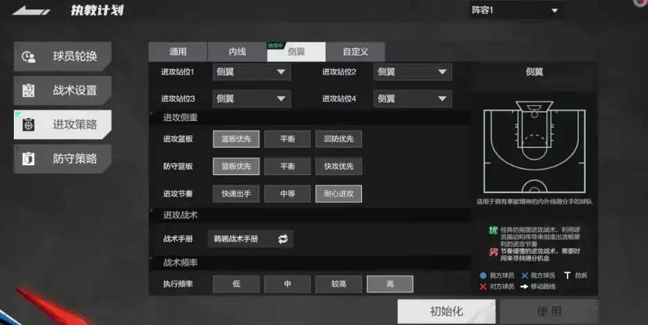 在开局前,可设置合适的战术策略。进攻方面选择侧翼模式,更易于触发三分;防守方面选择自定义策略,强力抢断和篮板控制,确保稳健防守。