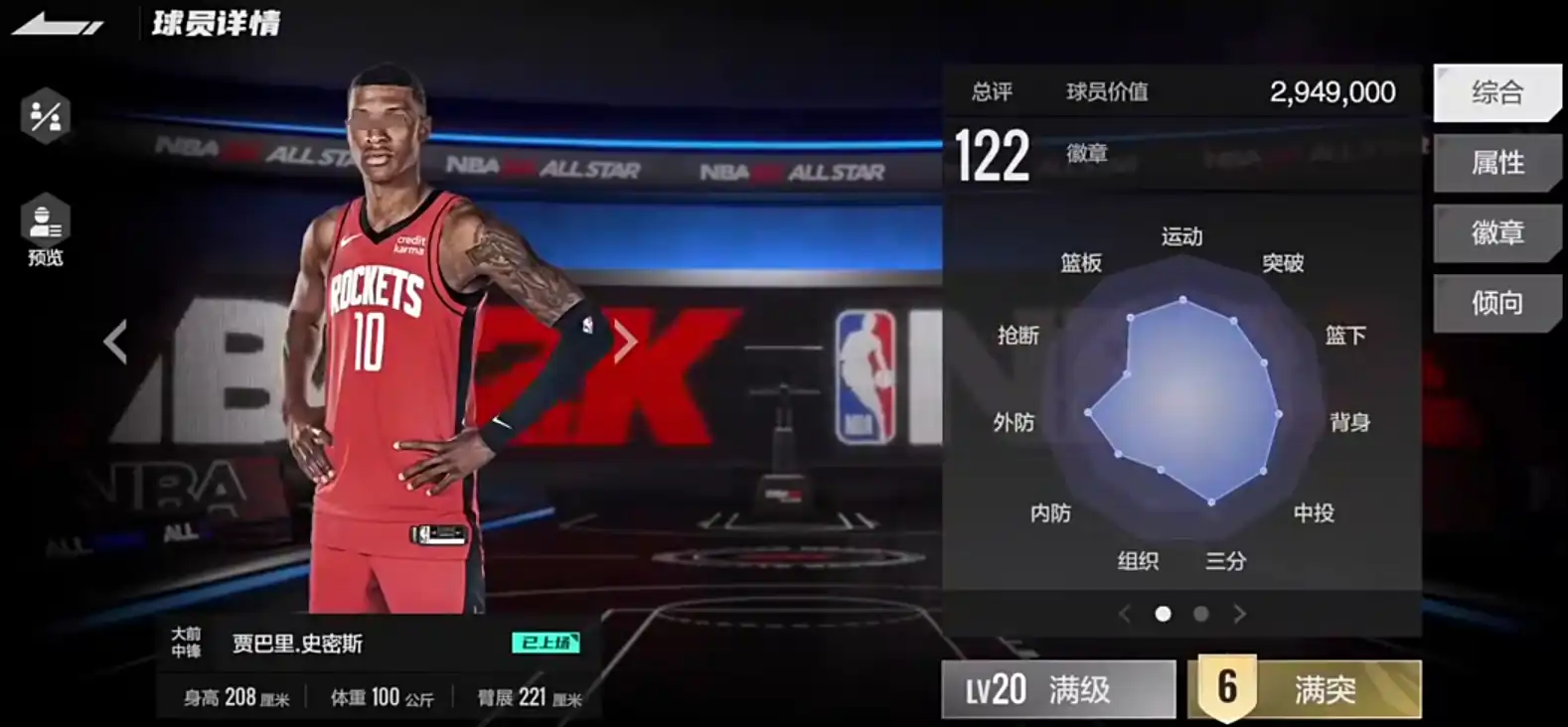 两侧底角加上弧顶共有三块,可以让他在不同区域中都能发挥的很好。从属性方面看的话,比较偏向于一个有冲板能力的3d的定位,另外122的中投、三分是具备投射能力的,所以个人的进攻能力更强,轻松获得更多的分数。