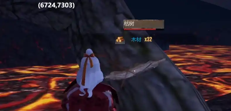 2、在火山这个地图上(6724,7303)的位置上,通过砍伐能获得枯木这个木材道具;