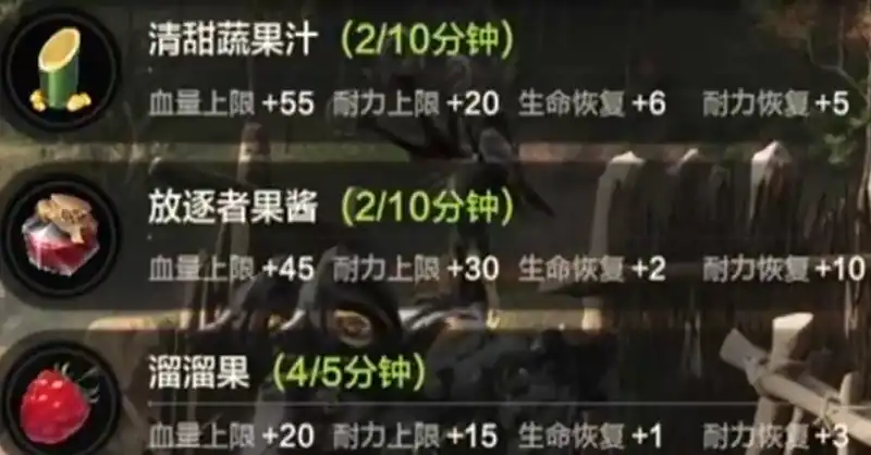 第1种是比较稳妥的,剑盾近战流,第2种是比较轻松的,远程输出流,另外不管选哪种战斗前准备好3种以上不同的食物,清甜蔬果汁、放逐者果酱和溜溜果,它们能提供120点血量上限,65耐力上限,和每秒9点的生命回复,触发吃跑喝足效果还能提升攻击力,让我们有不错的续航与伤害,玛卡方面有风属性玛卡就尽量带风属性的,没有就带等级高的,不过千万不要带电属性,因为会被克制。
