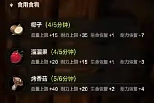 食物准备新手比较容易获得的椰子、溜溜果和烤蘑菇这三种,这些食物全部吃下能提供5点的血量上限、每秒4点的生命恢复和每秒14点的耐力回复,同时还会触发吃跑喝足加攻击力的增益buff,从而在战斗中有不错的续航和伤害能力。