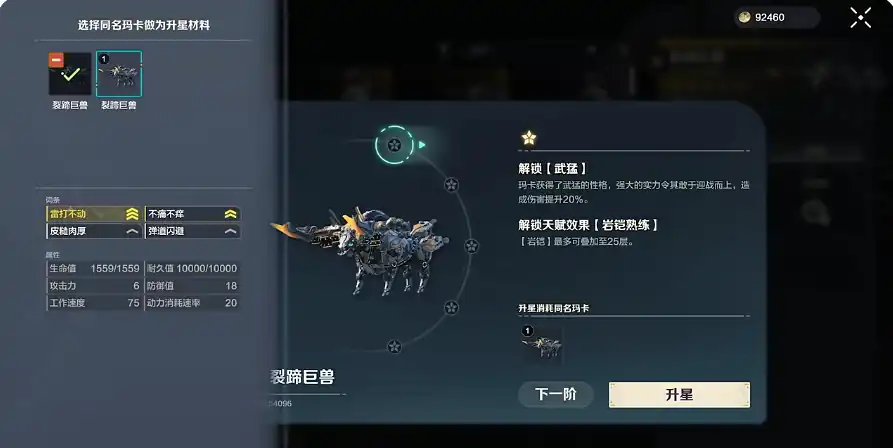 而升星需要消耗同种类的玛卡,添加材料的时候,可以查看作为材料的玛卡词条和属性等信息,橙色玛卡出生出生自带的词条几乎都是一样的,对橙色品质升星时就不用过分挑剔,蓝色紫色品质不同,升星之前还是要挑品质好一些的,这样后续可省不少的洗练材料,升星后就能查看对应效果。