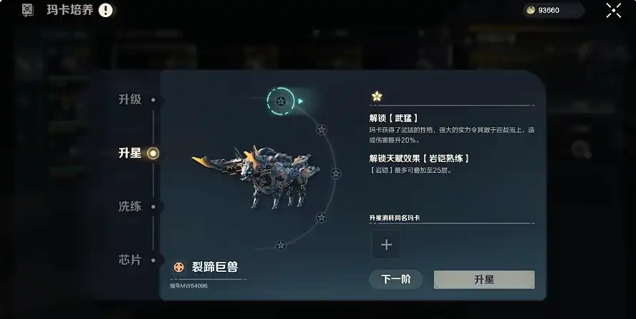 首先点击家园中枢,打开家园管理界面,选中想要培养的玛卡,在右侧它的详情栏中点击培养就可以了。它们的养成分为四种方式,升级,升星,洗练,芯片,升级需要消耗玛卡训练记录和亚金,在大世界探索时,以及对应的体力副本中可以比较轻松的获得,升级能提高攻血防三个基础属性,利用快捷放入就能升级到当前最高等级。