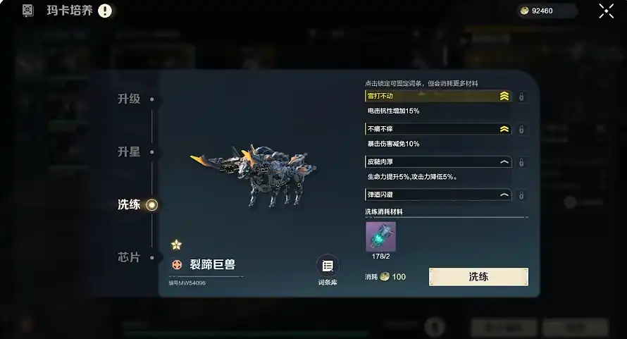 词条洗练:词条有三种不同品质,从词条外观也能看出来,在洗练界面点击词条库,就能看到对应玛卡能洗练出来的所有词条,洗练需要消耗对应材料和亚金,在洗练之前,可以选择将想要保留的词条先锁住,这个操作需要消耗额外的高级材料洗练晶体,洗的不满意还能恢复之前的词条。