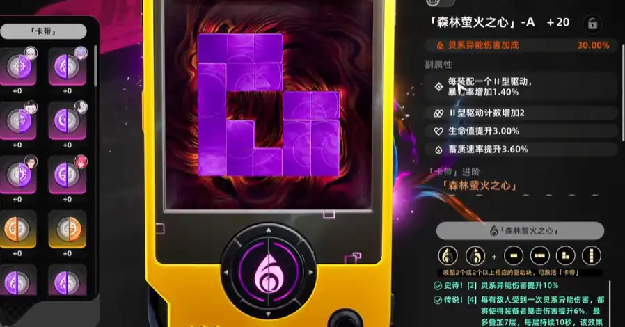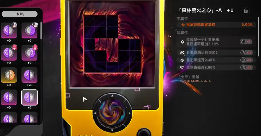 这时上半部分还会有空余的小方块,也要找到对应的方块填补起来,但是这个填补并不是随意的,要根据驱动的类型来选择正确的。不管是卡带还是驱动块,刷出来的时候副属性词条就已经固定了。驱动块的养成比较简单,刷出来好用的直接升级,而卡带的随机性会比较大,而且卡带的主属性会变,它的副属性当中最下面两条不要去刷,上面两条则需要去刷,每个卡带和驱动块对应的升级材料都是不同的。卡带和驱动块都有两种不同途径可获取,一种是消耗体力刷对应副本,另一种就是消耗游戏货币“甲硬币”直接在商店中购买。