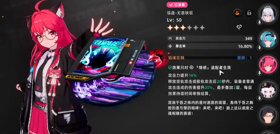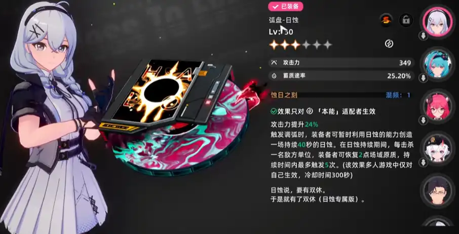 其实就是指武器,角色星级下面就会显示“适配弧盘”的字样,每个角色的适配弧盘是不同的,例如主角是“本能”,薄荷是“认知”,可以理解成角色的属性,不同属性就需要搭配不同的武器。弧盘除了有基本的属性之外,还拥有一个弧盘效果,比方说“无首铁驭”,武器效果只对情感属性的适配者才能生效。弧盘效果除了一些伤害的体现之外,还会对大世界有影响,例如“日蚀”的弧盘就需要做隐藏任务才能获得,日蚀能改变天气效果。
