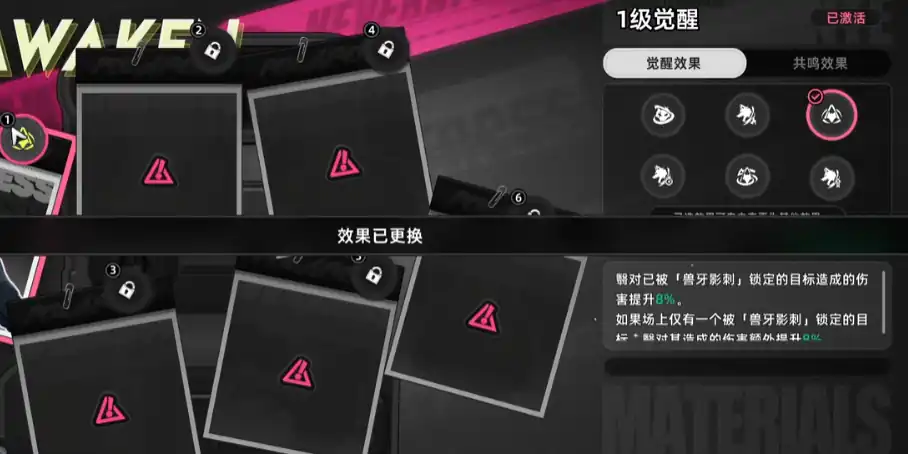 就是角色的命座,命座效果是可以自选的,以狼哥为例,抽出来是一命角色,觉醒效果却有6个,点击头像上方的圆圈,就可以选择想要的命座,之后完成变更,除了自选之外,抽到了3命6命之后,就会有额外的两个命座效果可以触发。