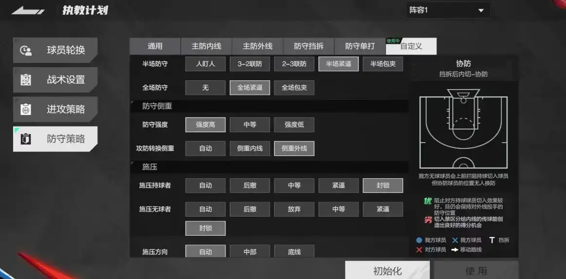 然后全场防守的话可以更改为全场紧逼,同样能够防御住每个对手。防守强度最好高一点,如此才能避免其突破防线。攻防的话更加侧重外线,之后可以在内线施压封锁住对手。然后同样封锁没有持球的对手队友即可,最后再采用自动施压的方法。