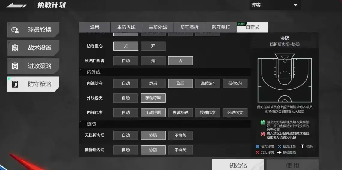 防守重心的话可以关掉,然后避免紧贴着防守挡拆者,对方离我们太近的话有可能犯规。内线防守同样绕后,外线包夹的话可以走手动呼叫的方式。至于内线包夹,同样手动呼叫就好。然后不管挡拆还是无挡拆都可以采用协同防御的方式,这样才能及时跟上。