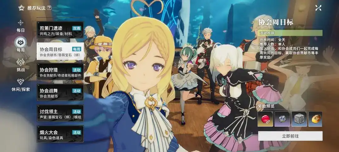 3、协会周目标。这是加入协会后的单人玩法,可和协会成员共同完成目标。4、协会狩猎。每周五晚上才开放,建议2-4人前往,活动开启之后,一起组队去猎场狩猎。4、协会战舞。也是周五晚上到周日开放,单人的模式,可以在协会活动中心来展示舞姿,能给参与狩猎的战友带阿狸增益。5、讨伐领主。单人组队都可以,能和最多20名玩法共同战斗,写手击败领主。6、烟火大会。休闲浪漫的玩法。
