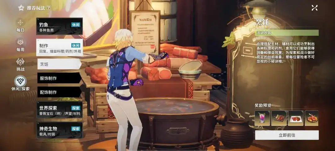 1、钓鱼,钓鱼是很休闲的玩法。2、制作玩法,烹饪、制作服饰,配饰,烹饪出的食物能作为药剂使用,可获得回复增益效果,是战前准备的重要渠道。3、世界探索,探索未知区域,获得珍贵宝藏。