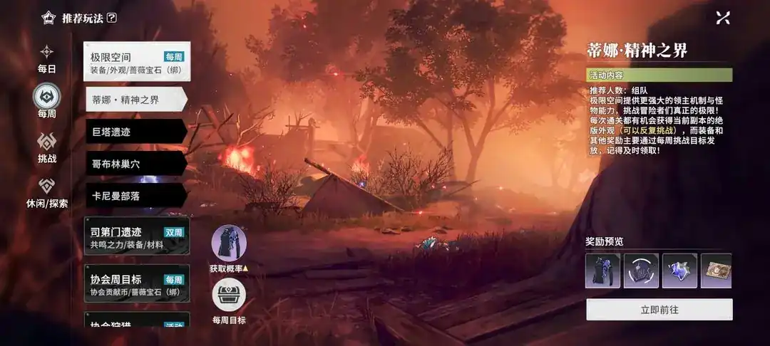 1、每周极限空间。推荐组队去玩,这里能提供更加强大的领主机制和怪物能力,这里会挑战大家真正的极限,每一次通关都有概率获得当前副本的绝版外观,能反复去挑战,装备和奖励是通过每周挑战目标发放。