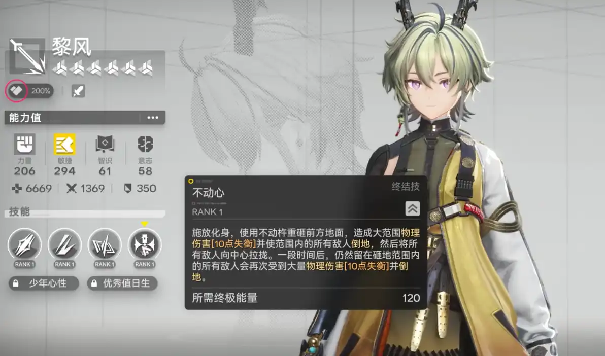 至于黎风的终结技在游戏前期则显得非常强力,在释放技能后黎风会对前方圆形区域的敌人造成一次击倒并且将敌人向区域中心靠拢,在一段时间后如果敌人仍在区域当中,则会再次受到击倒并且黎风会对角色造成非常高额的物理伤害。