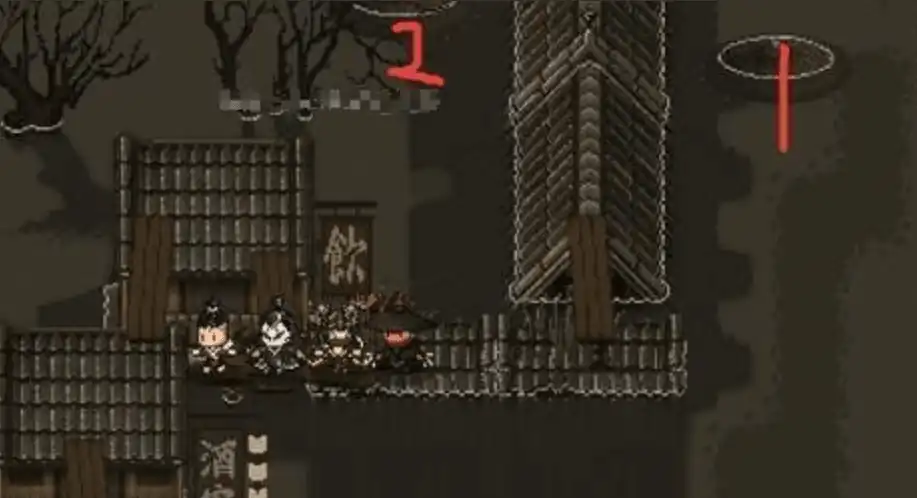 打完后开宝箱,能拿到解锁高阶武学的道具抱朴子,然后走箱子正右边的那个伞能拿到新的武功,拿到后返回刚才打架的地方,走左上方的伞到下图的位置,先走1号伞,换地点后一路走到头,能拿到武功沾衣十八跌。