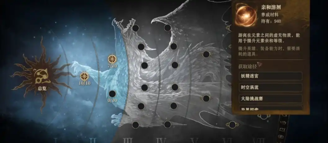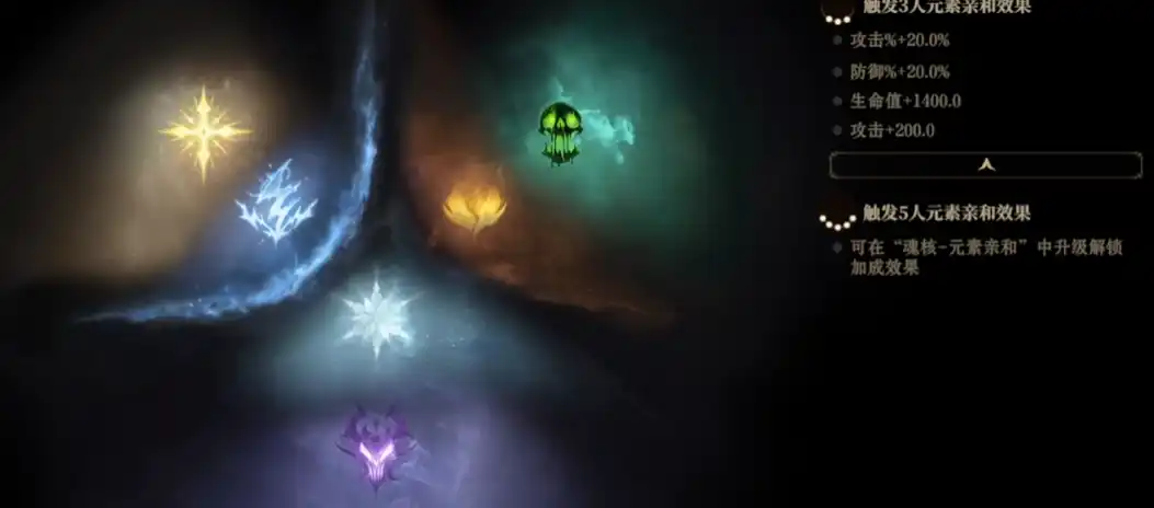 使用亲和溶剂能解锁亲和效果,这种效果包含3人和5人的效果,满足对应数量的元素亲和需求后,所有上阵的英雄能获得加成效果;而游戏里的英雄又区分为火,冰,光,电,暗,毒六种元素,元素之间存在亲和关系,亲和带来的属性加成根据亲和点分布而定。