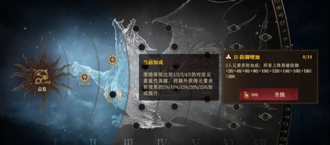 那在亲和天赋加点上,可以根据当前阵容有限考虑适合的亲和元素来提升,战斗时,如果组成的阵容达到了元素亲和系统的要求,那战斗力是能直接翻一倍的,初期的开荒就能使用3+2的阵容。