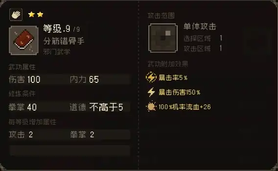 分筋错骨手,属于一门掌法,它作为少数拥有强大控制效果的掌法之一,当使用者在战斗中果断施展这门掌法时,敌人在掌法的作用下,瞬间便会失去行动的能力,这种控制效果并非分筋错骨手的全部威力所在,在实现强控敌人的同时,它还附带一段相当可观的伤害输出,在属性加成方面分筋错骨手同样表现出色,它可以给予使用者气血加成,