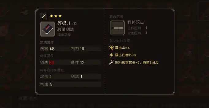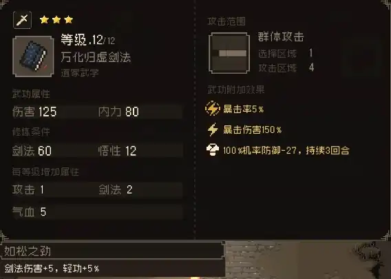 然后姬蘅剑法便是后期值得考虑的一种剑法,其基础伤害数值高达48点,并且能为玩家带来十点的内力加成,不过修炼姬蘅剑法也有一定的门槛,它要求玩家的剑法造诣达到六十点,同时还需具备12点的悟性,每成功升级一级,攻击力在有所提升的同时还有五点气血的增益,有群体输出的同时它还能进一步增强玩家5%的基础暴击率,并且使玩家的暴击伤害提升150%,甚至在战斗中有一定概率使敌方的攻击数值减少五点,从而在战斗中占据更为优势的地位。