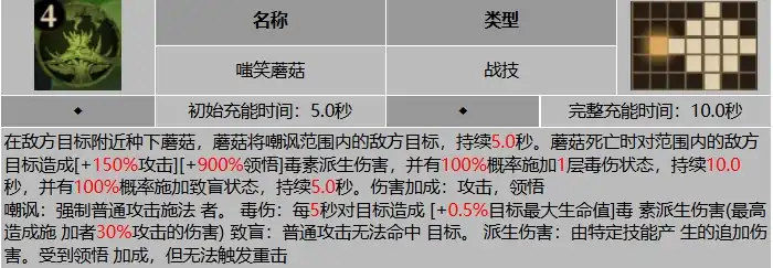 这个蘑菇具有嘲讽功能,能够吸引范围内敌方目标的注意力,使其强制对蘑菇进行普通攻击,持续时间为5秒,当蘑菇死亡时,还会对范围内的敌方目标造成提升150%攻击以及增加到900%领悟]的毒素派生伤害,不仅如此还会直接带来毒伤的影响施加,而且大家不用担心这个效果不生效,因为生效几率是百分百的,且有比较长的10秒可以利用。