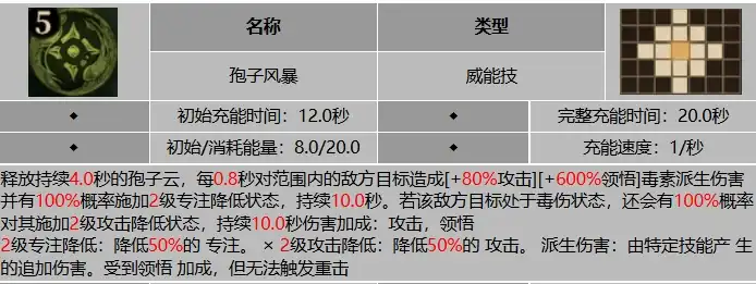 当释放这个技能时,会形成一片持续4秒的孢子云,在孢子云范围内,每0.8秒就会对敌方目标造成+80%攻击以及+600%领悟的毒素派生伤害,并且有100%的概率施加2级专注降低状态,持续10秒,如果此时该敌方目标正处于毒伤状态,还会有100%的概率对其施加2级攻击降低状态,同样持续10秒,这里的2级专注降低状态会降低敌方目标50%的专注,而2级攻击降低状态则会降低敌方目标50%的攻击。