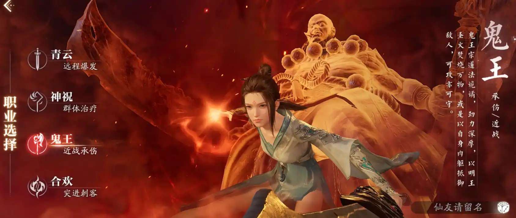 鬼王有点类似坦克型,具有强大的群体控制,一旦强力压制住敌人,战斗起来将无比爽快,普攻会攻击并击退身前的敌人,群攻技会重重砸向地面,对范围内敌人形成130%伤害后,牵引所有目标,释放后会回复20点怒气值,并为自己施加一个持续3秒的护盾,突刺技会跳到敌人的身前进行斩击,形成范围伤害并使得目标眩晕1.5秒,同时施加5秒嘲讽让自己获得20%的减伤;