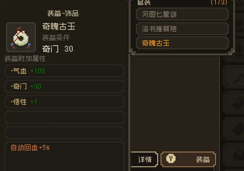 这个小李子的宝藏里面有一个非常不错的饰品,奇魄古玉。这个古玉在前期的装备之中非常不错。它可以增加100点的气血,30点奇门以及1点悟性。它的技能是100%的几率会自动回血+5%。但是装备需要奇门30点才可以装备。