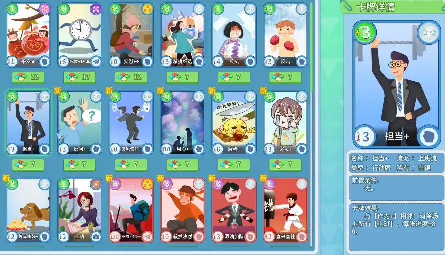 开局每回合研究一个开发技能,技能学习顺序依次为编程、服务器、架构设计,工作只选择F-及以上的任务,完成转正任务,打牌方面,只要属性满足,快速完成任务基本能获得A或S评级,利用快速完成功能刷出S评级即可,毕竟高压属性拉满的情况下也很难打赢,之后工作就从下往上依次点击任务,获取碎片和牌,行动力全部投入生活,用于练习属性,不再学习开发技能。