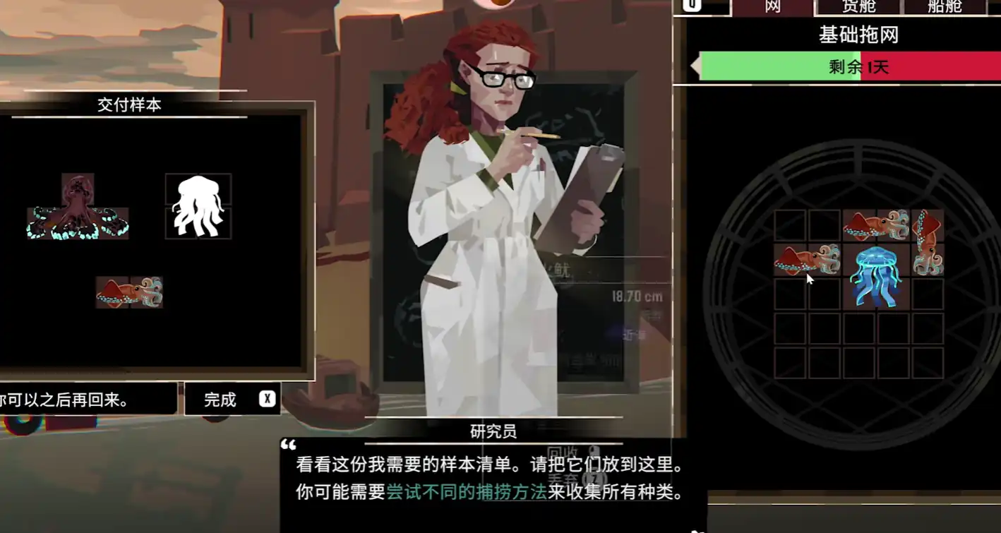 样本全部收集完成后,玩家折返寻找到研究员,即可将样本兑换成圆形零件,圆形零件是用于制作深海钓钩的重要道具,玩家在取得零件后,折返进入到铁匠铺,就能给自己打造一份深海钓竿了。