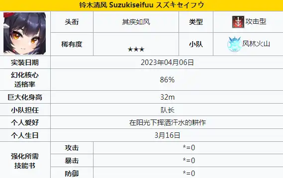 铃木清风:在普通攻击之后,就可以针对敌方的目标造成对应比例的伤害,在战斗开始时同样也可以提升输出的能力,可以获得永久的自身机动力。