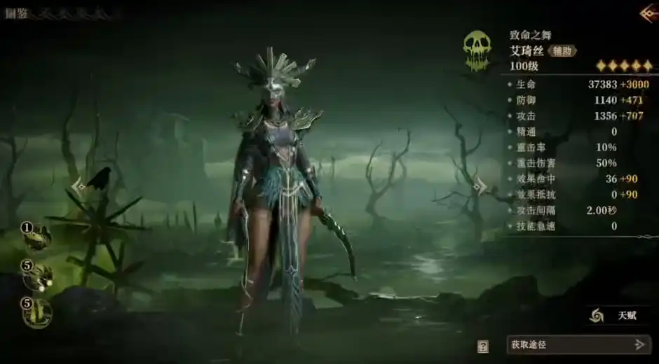 艾琦丝,这位操控毒素与魅惑的高手,其被动技能极为实用,每当她成功对敌人施加减益状态时,便能额外使该目标所受伤害降低10%,而她的战技能够对范围内的敌人造成高达280%攻击力的毒素伤害,并且有75%的几率施加5秒的禁疗效果,让敌人在中毒的同时无法得到治疗,当艾琦丝开启大招时,更是能对范围内的敌人造成毁灭性的打击,她的大招不仅能造成550%的毒伤,还有35%的几率施加5秒的魅惑效果,使敌人陷入混乱,转而攻击自己的队友,同时还有85%的几率施加10秒的充能速度降低状态。