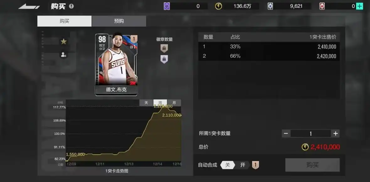 德文布克可以说是游戏中非常抢手的强力射手球员,也是在1号位中的顶尖选择。在得分方面,他近距离投篮属性162,中投155,三分138,这样的数据可谓非常优秀,在徽章方面该有的射手徽章都非常齐全,组织徽章方面也很出色,双速属性方面都达到了129,这样的属性,使其真正成为1号位的持球挡大哥。目前游戏的三种模式中都有很好的表现,是真正具有潜力的核心球员。