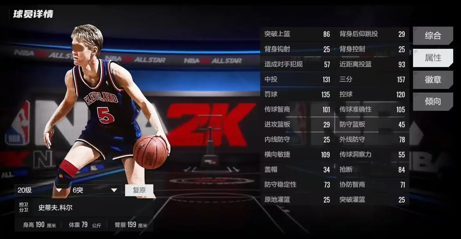 史蒂夫科尔的位置是控卫和分卫,他身高190,体重79,臂展199,在得分能力方面,三分非常突出,还有不错的运动和中投以及组织能力。这个模型在后卫中还是比较中规中矩,得分方面,三分线弧顶到左侧45度都是他的热区,三分是他非常拿手的武器,属性方面中投131,三分157。这样的三分属性在联盟成员中都是极为顶尖,中投属性也可以作为常规武器来使用。
