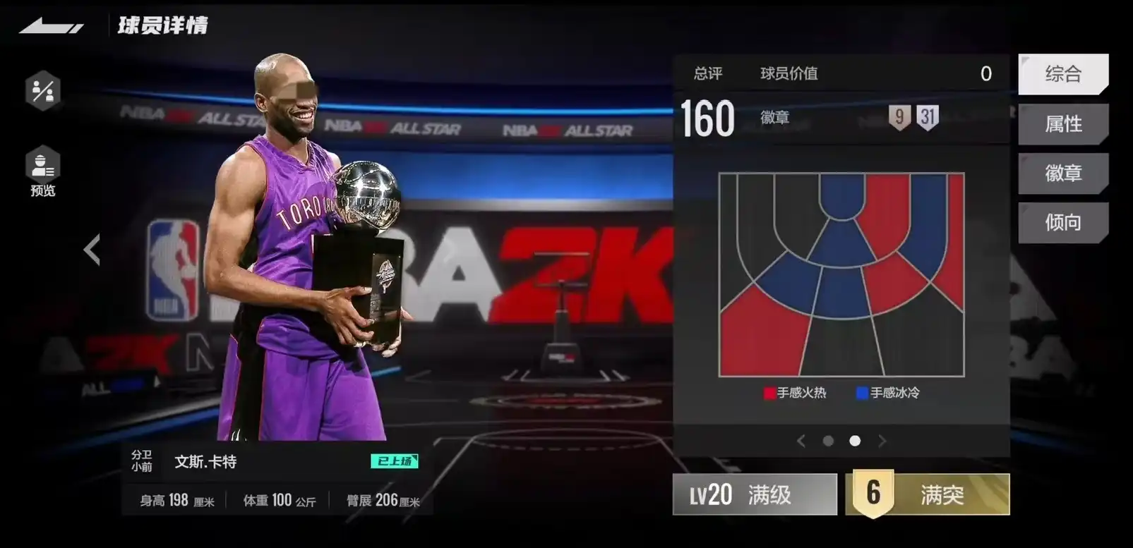 接下来看一下详细的各项属性,文斯卡特在攻防两端都有强大实力,例如152的突破上篮属性,150的中投和145的三分,122的站扣以及168的跑扣,几乎将常规的进攻手段全都点满。无论大家选择在内线还是外线得分都非常轻松。其他方面,122的外防,133的横移,在防守对方外线球员时也比较有优势。虽然93的盖帽数值上不高,不过配合上自身168的弹跳,以及所具有的徽章,还是可以防守住大部分球员。还有145的速度和165的体力这两大属性,让卡特在场上几乎可以任意去发挥,他的下限就是很多球员的上限,确实说真的是数值怪。