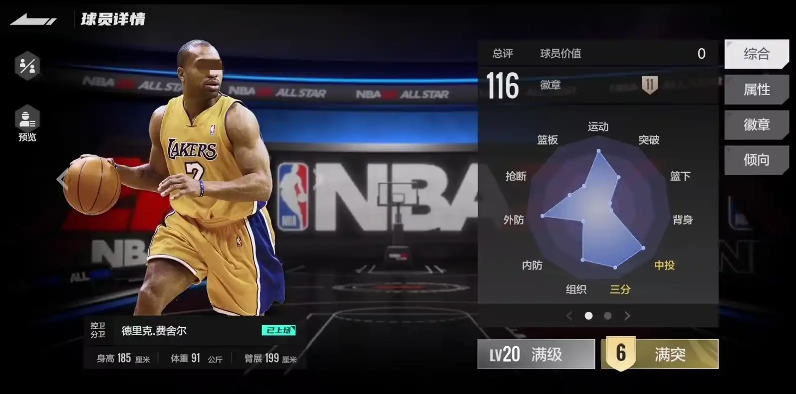接下来看一下具体的属性,拥有135中投和140三分,这样的属性使其具有了顶级后卫的投射基本能力,还有140控球和135传球,作为控球后卫看家本领完全足够。其他属性方面,外防116,横移135,可以弥补自身在模型方面的不足,防守上也算有了一些优势。131的速度是小个子球员标准配置,这样的速度配合上模型,能够在场上自由灵活游走。特别注意的是,站扣和跑扣数值仅为25,这就意味着他几乎无法实现扣篮。