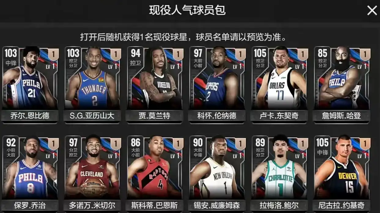 第2个卡包是现役人气球员包,既然是有人气的球员,自然在实力方面会更强一些。例如可以开出200万的单卡约基奇。或者是100万的单卡恩比德,以及拥有乔丹风格的压力山大等。这里面出现的球员都很好用,但是大家也要注意,这里面的尼古拉约基奇容易踩雷,开服之后定价达到200万,但是后续一路下跌,所以抽到之后同样快速出手。同样需要快速出手的还有詹姆斯哈登,以及锡安威廉姆斯等。