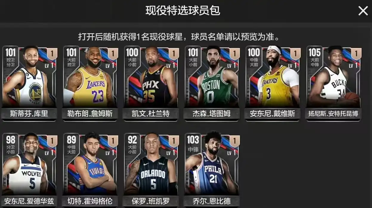 第5个是现役球员特选包,这里面一共有10名球员,包括勒布朗詹姆斯,凯文杜兰特,安东尼戴维斯等,都是顶顶大名的球星,每一个开出来都可以当做球队的核心。最后一个是未来之星球员包,这里面的球员主要是近两年nba出现的新秀,即有上限达到200万的文班亚马,还有初始价二三十万左右的球员,所以说这里面的差距也是比较大的。如果能够从这个包开出文班亚马,那么绝对是开服血赚,不过其他的卡并没有太大的作用。但是文班亚马只在新秀包产出。