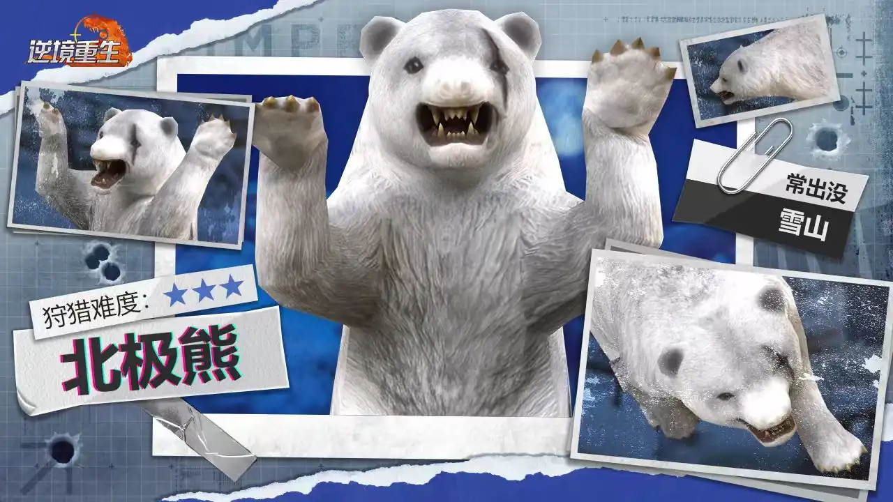 第6个北极狼,常出没于雪山等地形中,有一定的狩猎难度。第7个北极熊,雪山区域还有一种动物是北极熊,北极熊因为体型庞大,所以狩猎难度性更高一些。第8个棕熊,经常在山林出没,体型庞大,狩猎难度较高,能够提供肉食和皮毛等资源。第9个生化蝎常在沙漠地形中突破狩猎难度中等。除了这些动物之外,游戏里还有非常多的恐龙,虽然不是现实世界中存在的,但是也是可以狩猎的对象。但是恐龙实力普遍较强,所以大家在狩猎之前必须先做好准备。