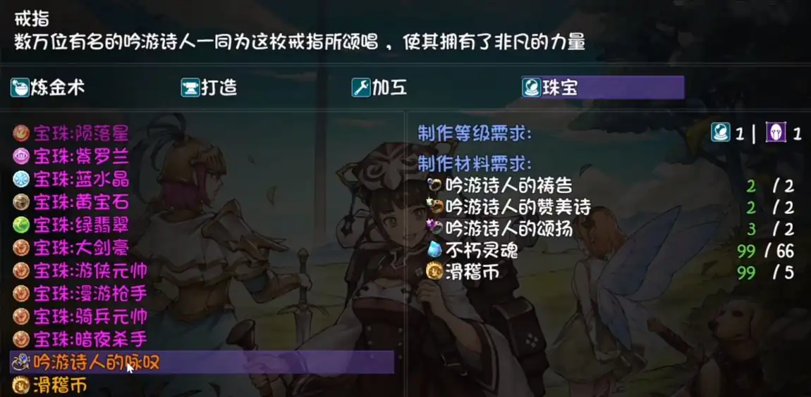 拥有图纸之后,想要打造吟游诗人最高级装备的咏叹是需要这个系列的祷告、赞美诗、颂扬以及不朽灵魂和滑稽币这些道具。集齐这些装备之后就能开始制作了。祷告在35级深渊梅林之影处掉落,赞美诗在45级深渊怪处掉落,颂扬在60级深渊怪处掉落。