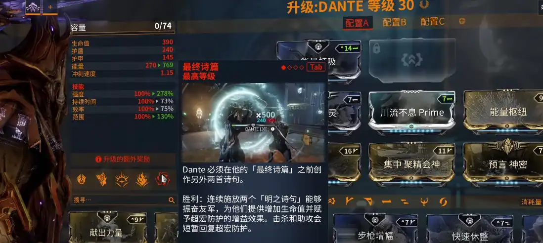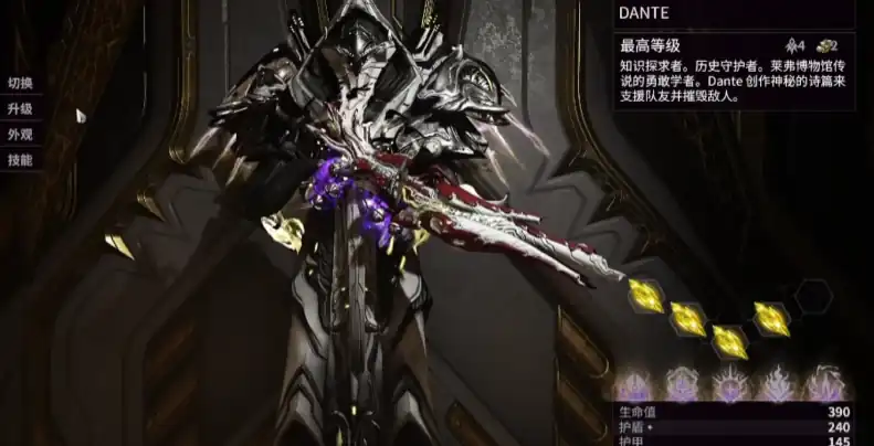 被动技能“编年史之印”,但丁的显赫类武器“夜枭”可以扫描目标,记录信息以供使用。对已完全扫描的目标,状态几率增加。技能“明之诗句”,但丁的振奋旋律为自己和盟友提供境界,并且能增加生命值。