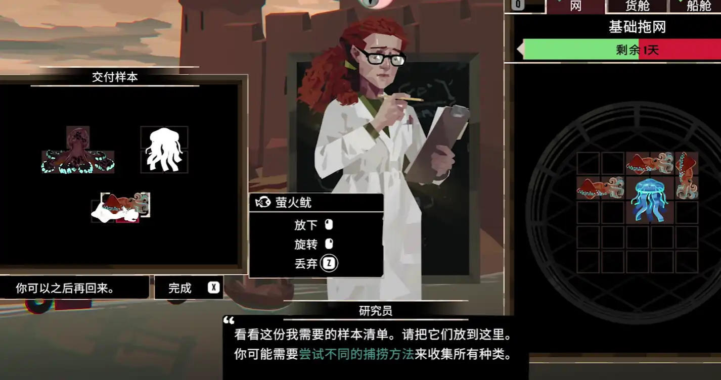 在玩家获取了所有标本之后,直接将标本交付给研究员即可,此时研究员可以进行零件的改造,并且玩家会获取该装置的设备,随后玩家就可以解锁海钩钓具了~