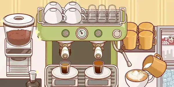 玩家需要从研磨咖啡豆开始,首先使用磨豆机将咖啡豆研磨成粉末,然后将咖啡粉放入半自动咖啡机中,以制作不同类型的咖啡饮品。根据消费者需求,选择不同水杯(如咖啡杯或玻璃杯),加上萃取咖啡、牛乳泡沫、糖浆等物质,制作完成即可给客户饮用。