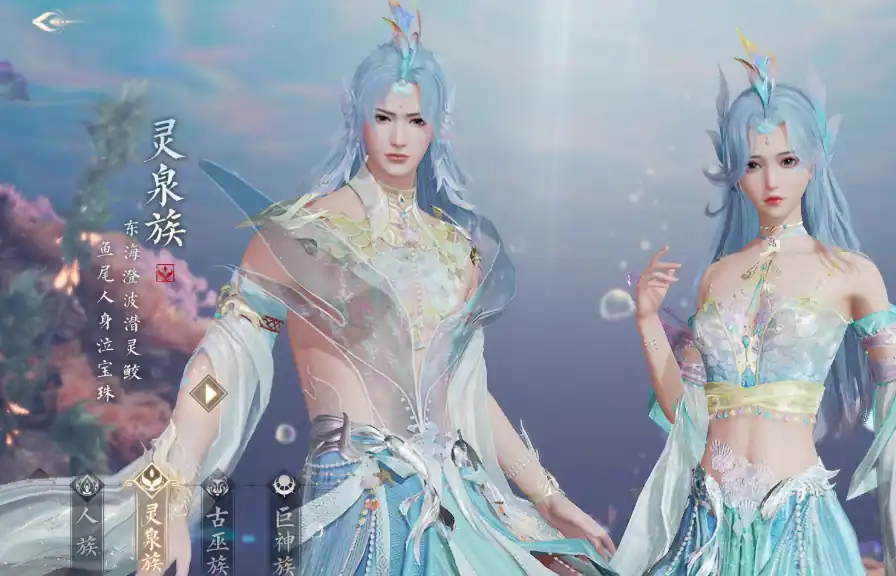 有鱼类特征的灵泉族,它是龙族的后裔,拥有龙珠的血脉跟灵魂,他有长水蓝色的头发,有鱼跟人两种不同形态。在陆地上,他其实是人形,到了海中则化为鱼生。他在海里面有一定的优势。