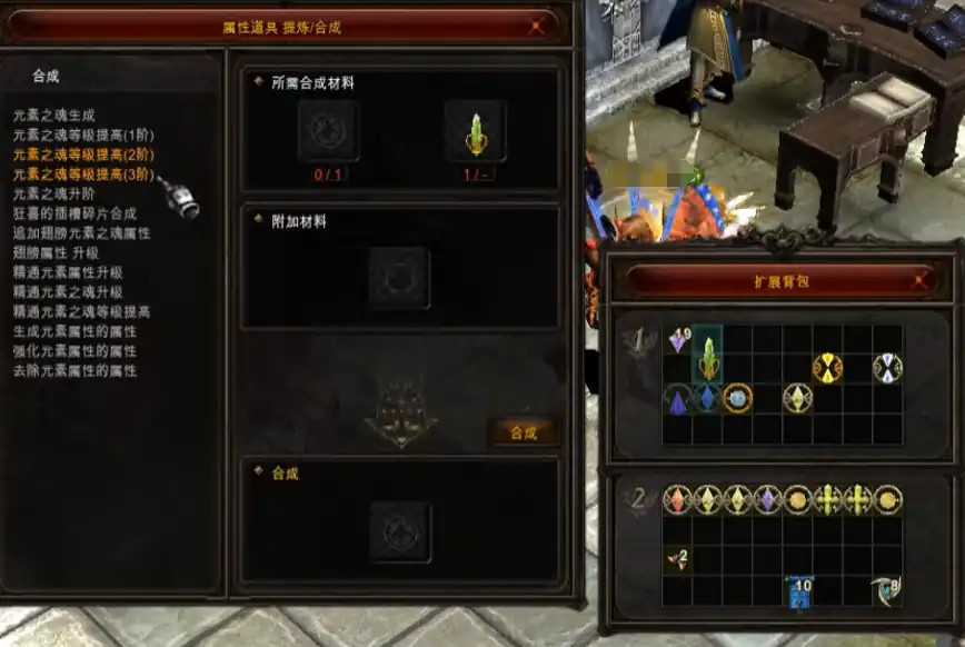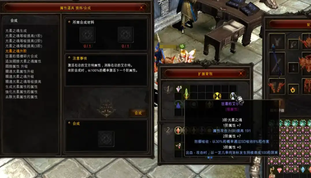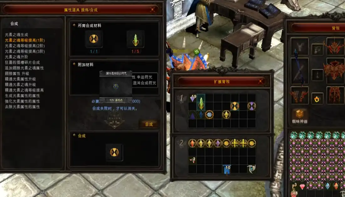 接着在自己的背包里面找到两个狂喜,接着我们要将他们强化至+7。然后再点击第二个对话选项,也就是元素之魂等级的提高。除了需要放入一个狂喜之外,然后还要加5个强化道具。如果你担心强化失败的话,就可以放入一些保护符咒。