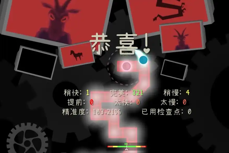 人造战车关卡的一开始就是难度很高的两个S型弯,所以在开始之前建议大家先预演一遍,以防出现心里没有预期而导致的脱出轨迹问题,同时可以将小球的速度放慢,保证判定的精准和高得分。完成这一条路径后,会进入四个连续的正方形轨迹,这里的节奏也并不算快,稍稍注意就能通过,需要注意的是接下来的一个三角形弯道,因为更换轨迹的问题所以接下来这个弯道会以绿色描边的形象出现,不要漏打,但值得庆幸的是这一部分的鼓点清晰,且速度较慢。