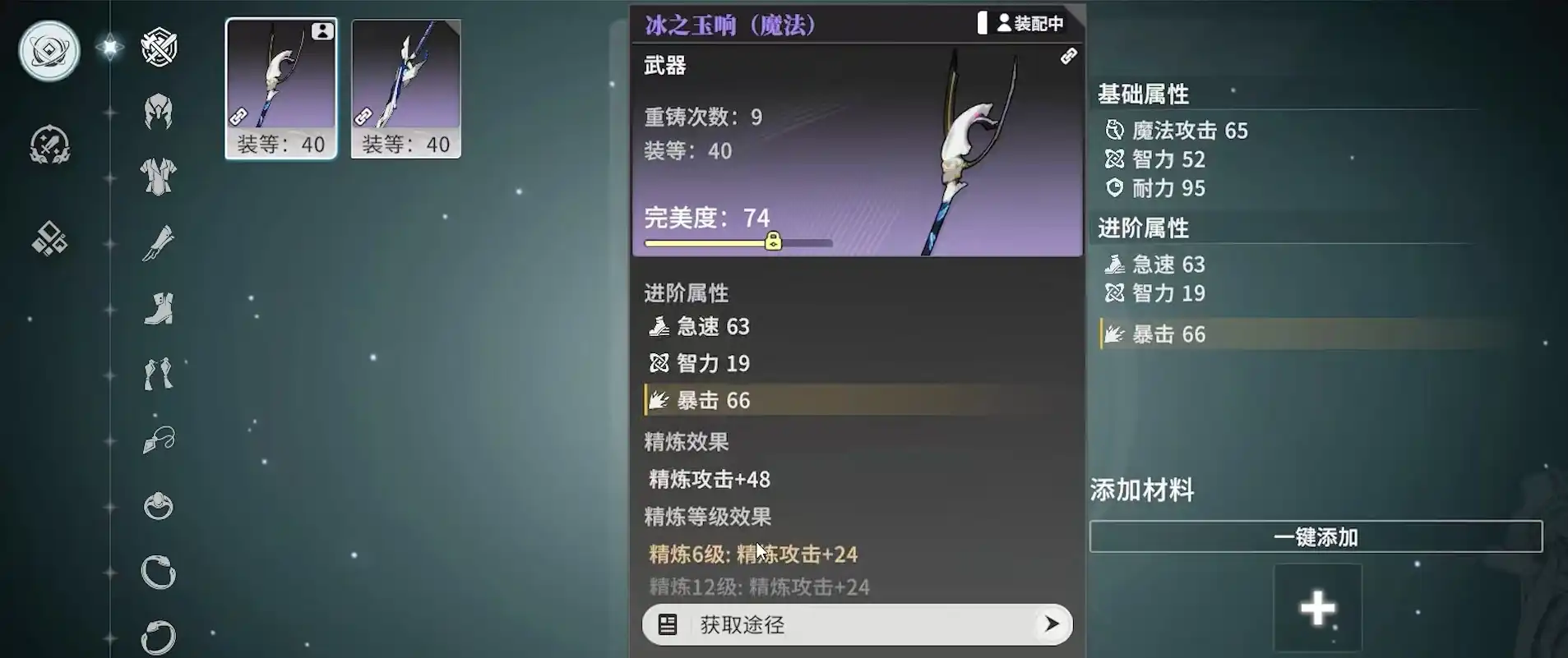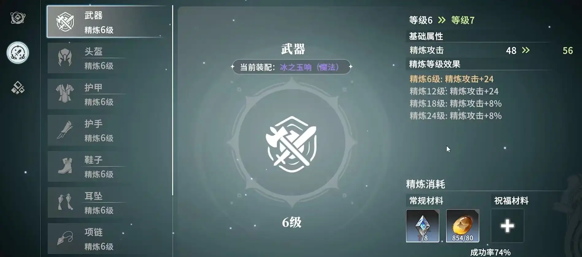 有了装备之后并不算完,还需要进行下面的重铸,获得了重复的装备就可以直接用于重铸的原材料,打造出符合自己要求的装备属性,提升装备完美度。在原有进阶属性的基础上,再增加一条随机属性,每次重铸都会刷新完美度,达到100之后,就可以自行选择一条属性,所以多多获得装备就可以不断的进行重铸,直到自己满意为止。精炼是需要消耗神圣金属和辉耀石去对装备来进行精炼,不同材料有着不同对应位置,当精练达到一定等级时,就会获得相应等级加成,不同位置装备获得加成属性也有所不同。