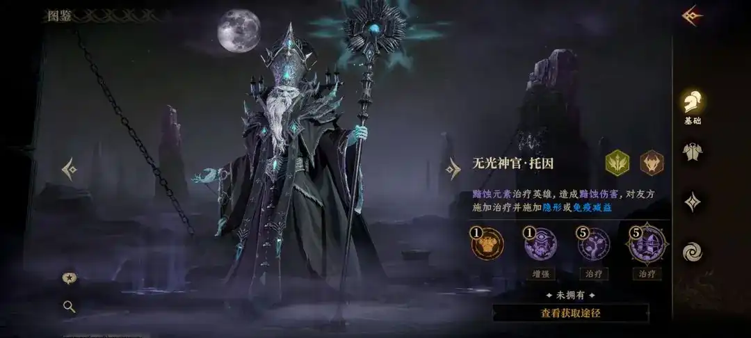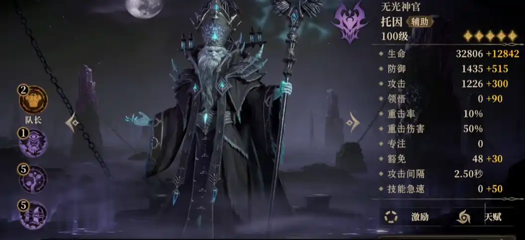 他可谓是暗系的大奶,也是为数不多能提高前排坦度的男奶妈。自身防御和血量的一定程度能增加前方英雄的血量,不管是对于保护核心,还是坦克都有巨大的提升效果。队长技适用于所有在战斗,能提高友方50豁免。”暗影之护”的被动,在战斗开始前,表示并强化自己身前第一个队友,令他获得神官25%生命上限和防御效果,之后对自己添加隐形状态,隐形中的他无法成为单体技能的目标。