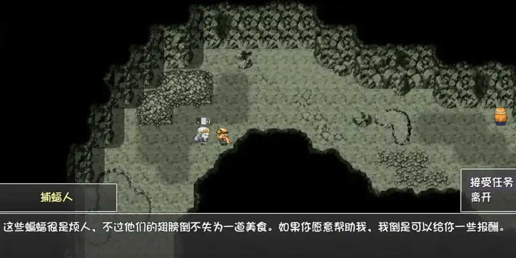 先前往洞穴,在其中找到下图中的NPC捕蝠人,和他对话后接取任务,任务非常简单,只要击杀蝙蝠拿到7个蝙蝠翅膀就可以提交了。