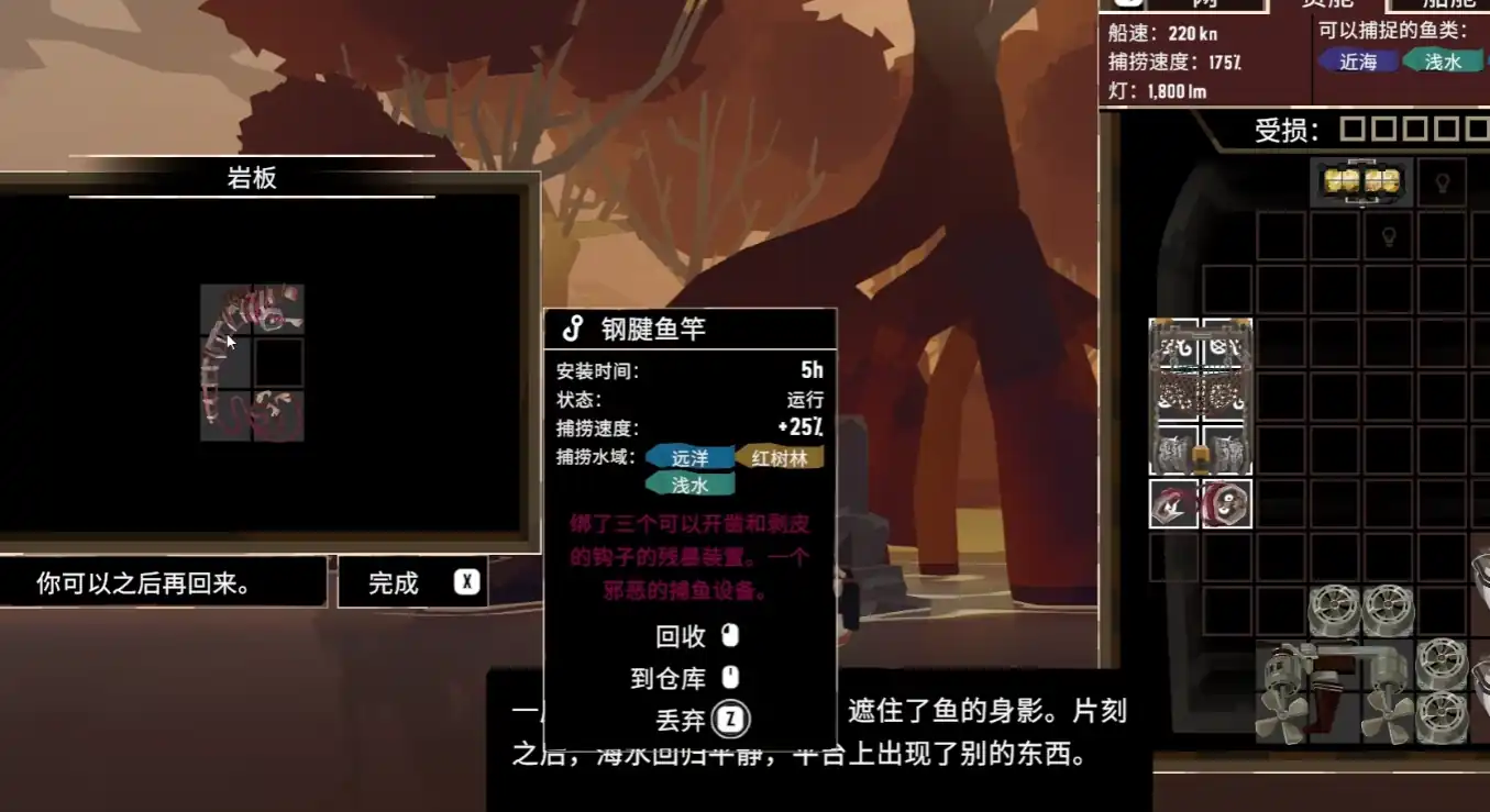 岩板的放置任务非常简单,玩家只需要将祭品完整的放入到岩板的储物空间内即可,玩家要注意各空间的容纳储备量,通过调整个鱼类的朝向,来破解石板的解谜,在完成了所有的岩板解谜后,玩家分别可以获得京线轴、钢剑鱼竿、深渊巨口、肉色起重机这四个重要的道具。