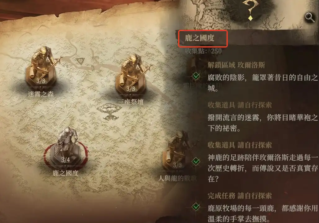 鹿之国度是游戏里的【纳瑟瑞亚】大陆的四大区域之一,另外3个区域分别是迷雾之森、三座祭坛、人与龙的战歌。每个区域都有一些任务需要完成,鹿之国度这里有四个主要任务。